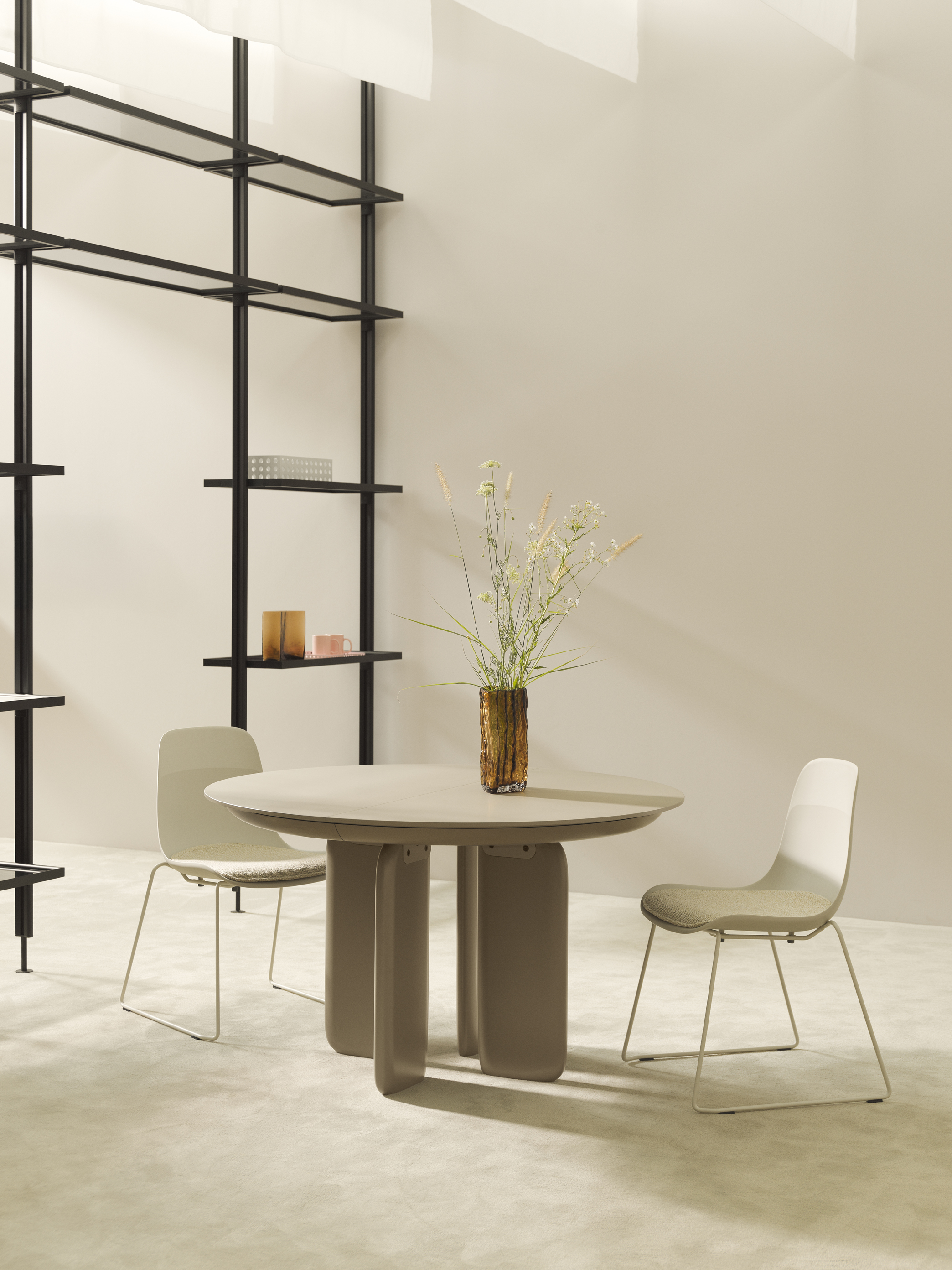 Pala is a system of round, oval tables whose leg resembles the blade of a rudder. Also available in the fixed version, it stands out for its fluid and innovative extendable version, a distinctive feature of the Kristalia table collections. Available in different materials for tops and structure.
