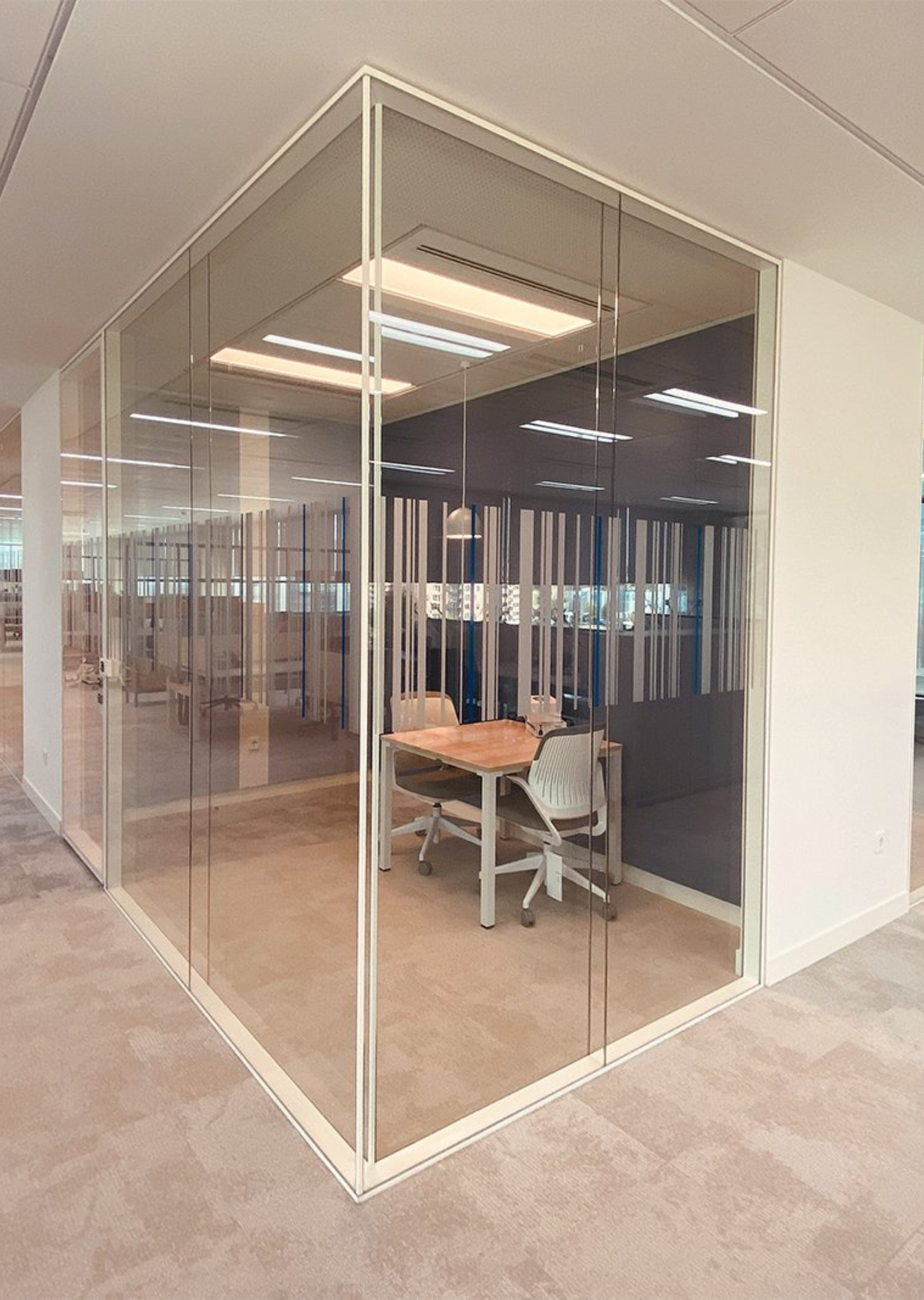 Internal steel structure covered by extruded aluminum profiles fixed to the ceiling and floor, guaranteeing the structural stability of the system up to heights of 3 meters. The glasses are joint vertically by transparent adhesive tape or by polycarbonate profiles. System studied to achieve maximum assembly speed with the minimum components, adapting and providing solutions to the special needs of each project. Acoustic attenuation up to 46 db. Two standard finishes for aluminum profiles: matt silver anodized, matt white and extra matt black lacquered.