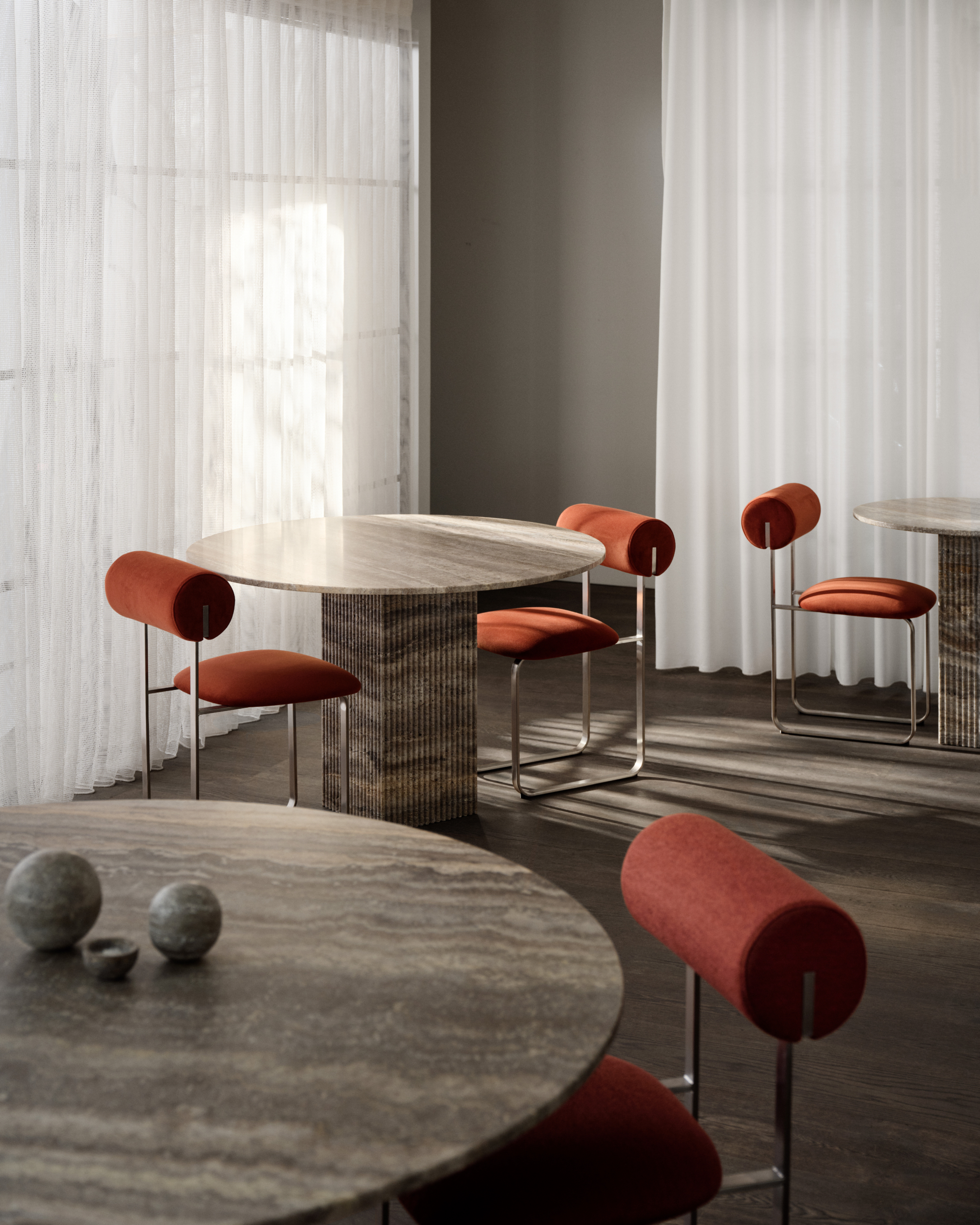 The idea for the design was sparked during a stroll through the neighborhood, where the fluted building facades left a lasting impression and is directly reflected in the fluted column that forms the core of the table. The fluted surface adds tactility but also creates a dynamic and shifting interplay of depth and shadows throughout the day, depending on how the light falls upon it.