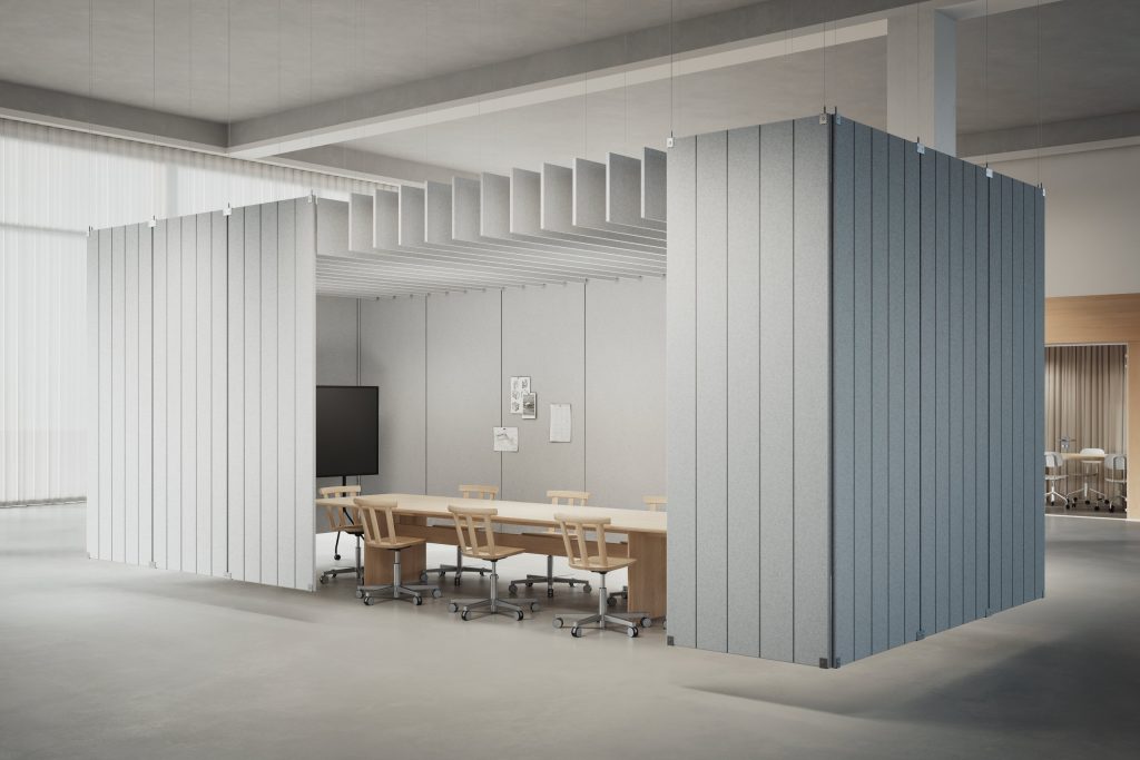 BAUX X-FELT FLOATING PANELS TRANSFORM OPEN INTERIOR INTO SERENE AND PURPOSEFUL SPACES. THESE LIGHTWEIGHT, WALL-LIKE ELEMENTS CAN BE SUSPENDED TO DEFINE ZONES, CREATE NICHES, AND FORM SCREENS OR ROOM-IN-ROOM CONFIGURATIONS, ALL WHILE ENHANCING ACOUSTIC COMFORT. THE SOFT, TACTILE SURFACES OF X-FELT NOT ONLY ADD WARMTH BUT ALSO SEAMLESSLY INTERFRATE FUNCTIONAL ACOUSTICS INTO THE ARCHITECTURAL DESIGN.