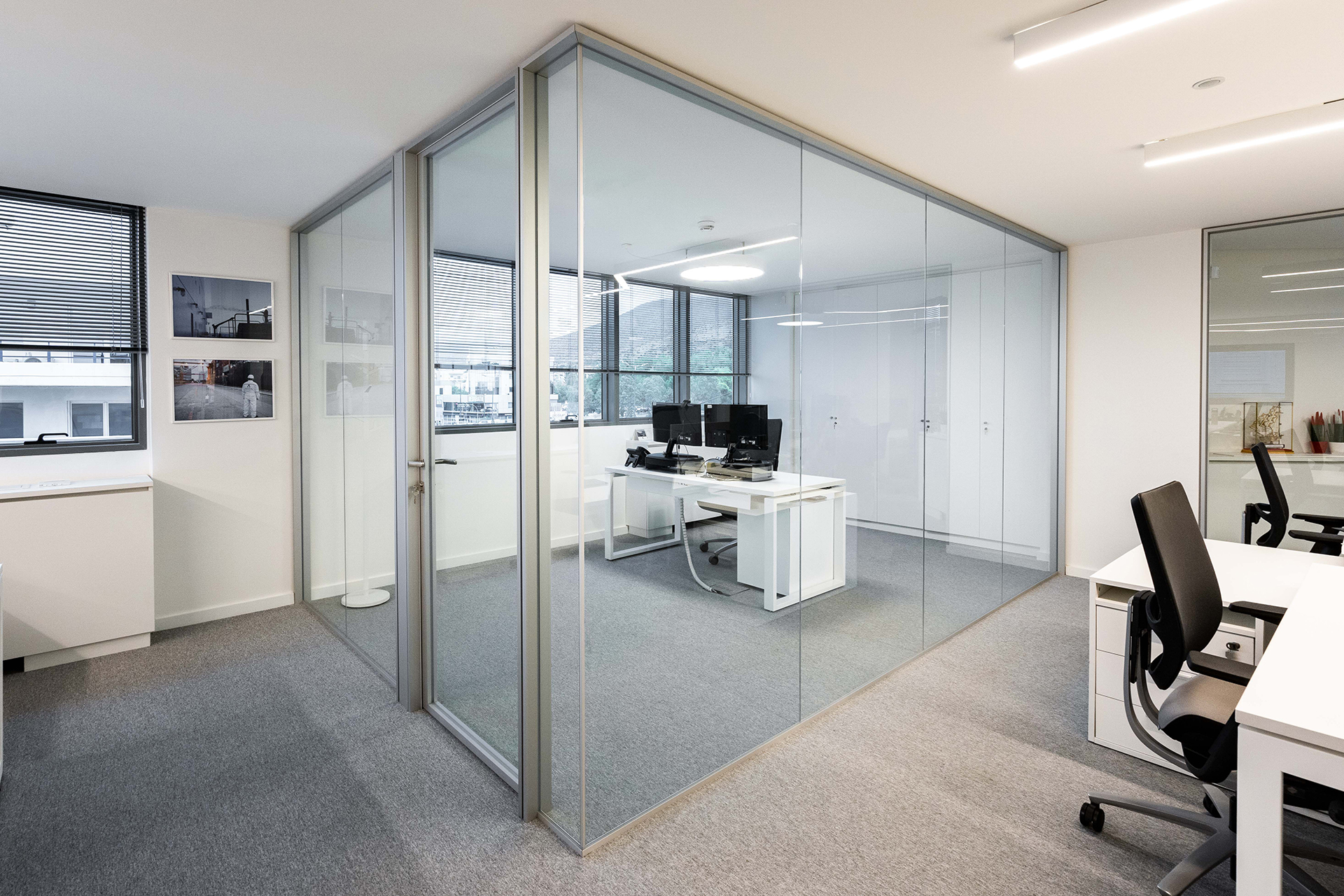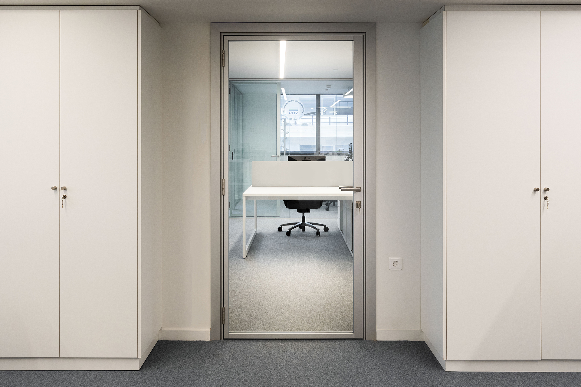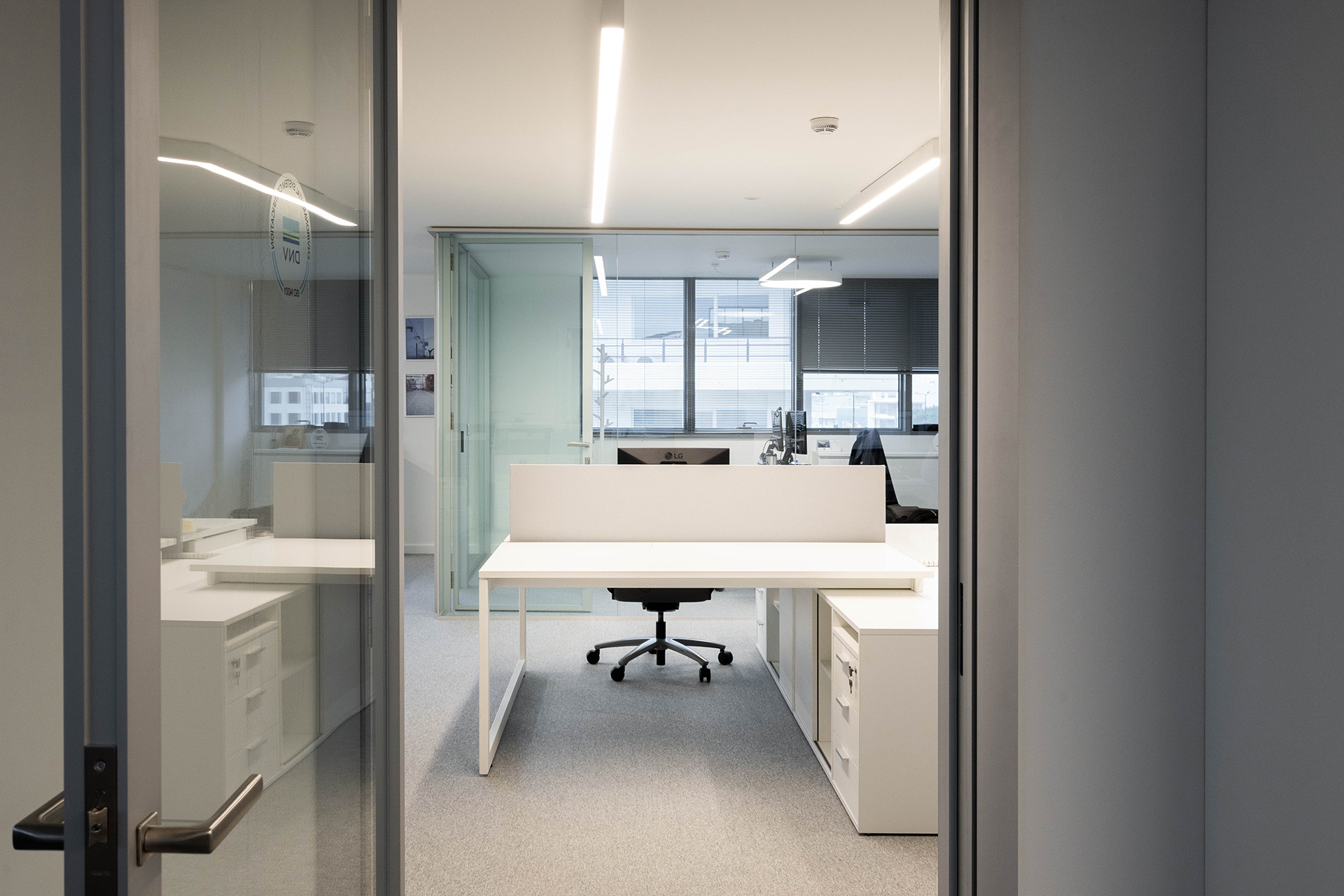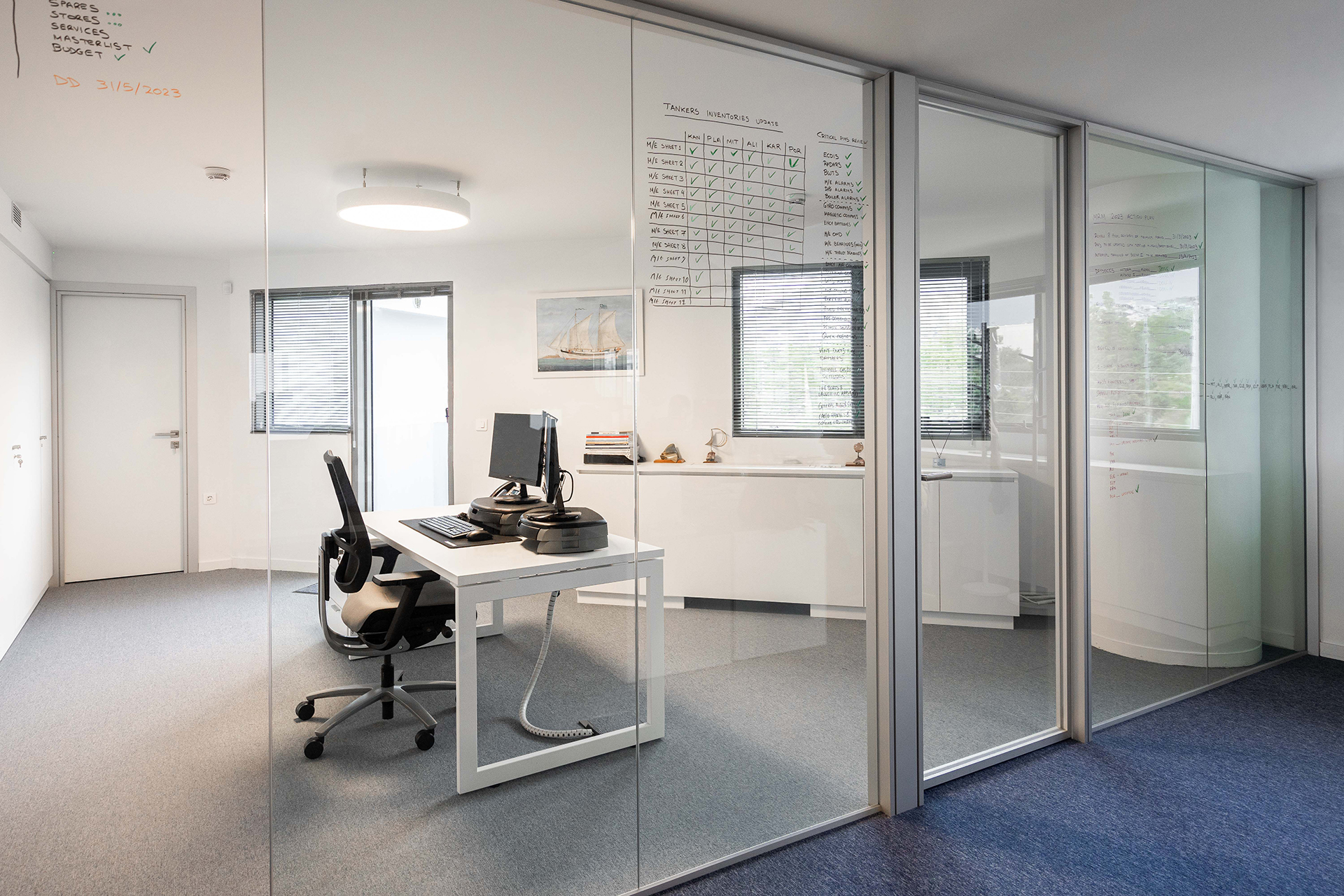 The Maritime Company trusted us once more for the supply and installation of office equipment in their new facilities.The floor was covered with carpet tiles from the ESSENCE collection by TARKETT DESSO. The tiles that have been used are in three different shades, that align with the color palette of the corporate identity. This choice serves the purpose of creating zoning. Closed Office Spaces are created using the integrated sound insulating aluminium partitions system TREBE, in natural brushed matte finish. It consists of fully glazed surfaces in single or double laminated glazing and solid melamine parts that enhance the privacy. The system is completed with sound insulating glazed and solid doors with aluminium doorframe and a technical unit. The same doors can be installed in existing wall openings as well. Blinds are included between the double partition glazing, as an extra feature for privacy.