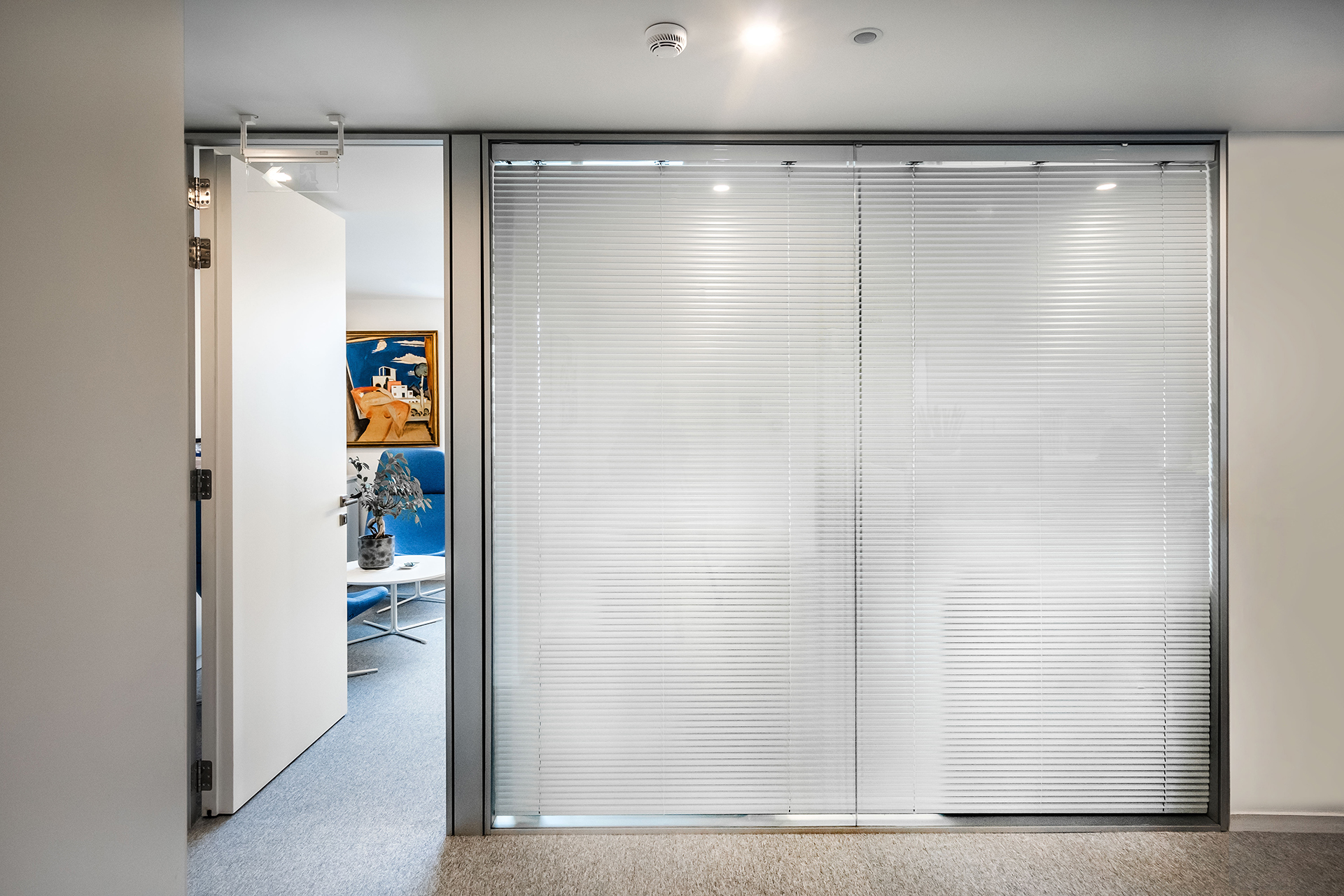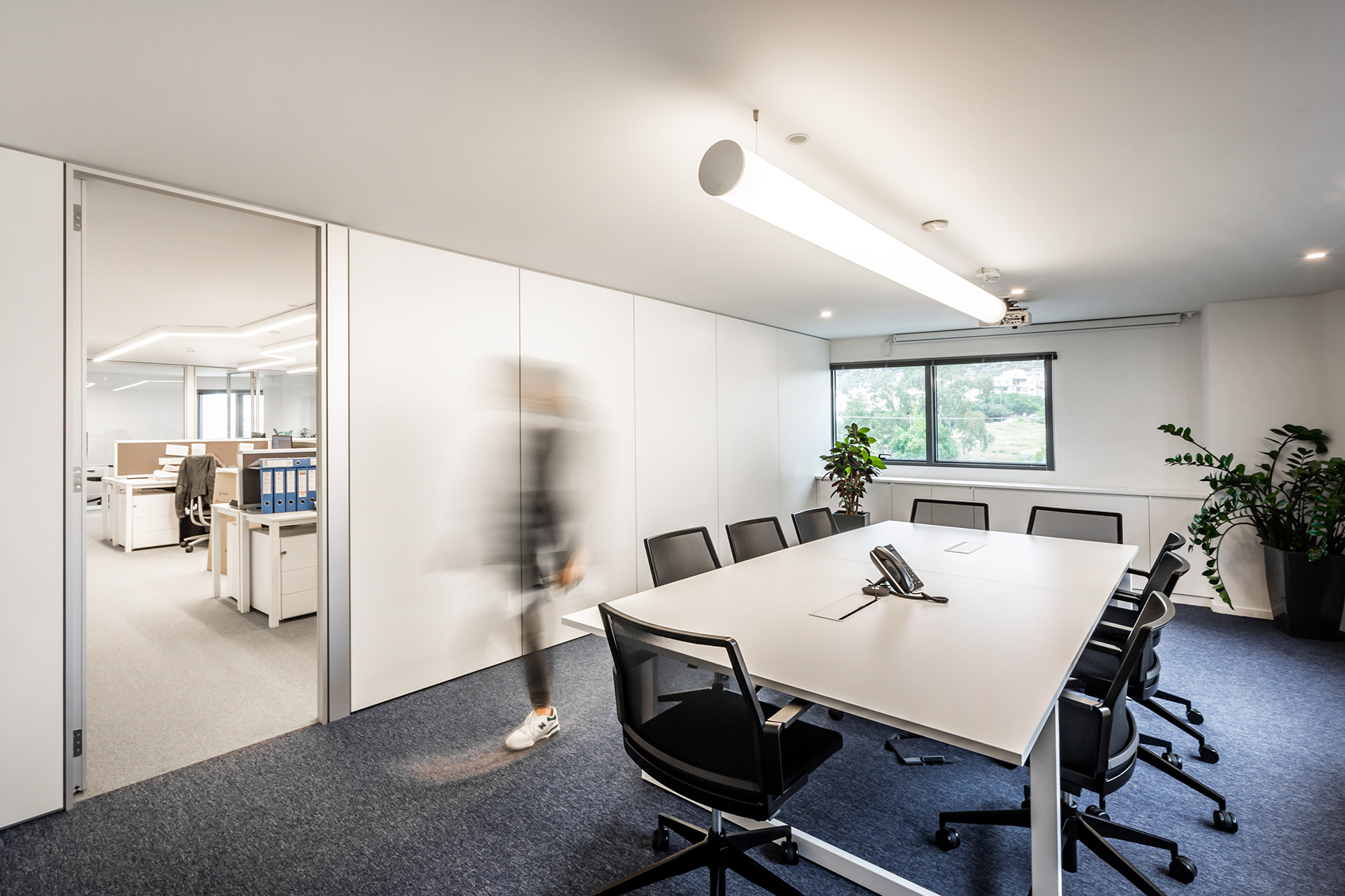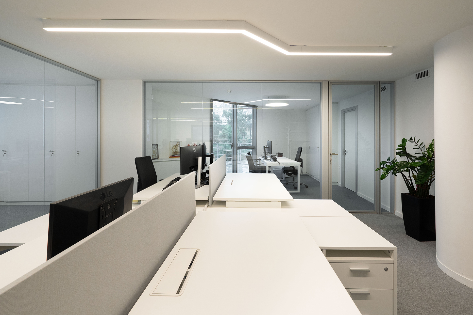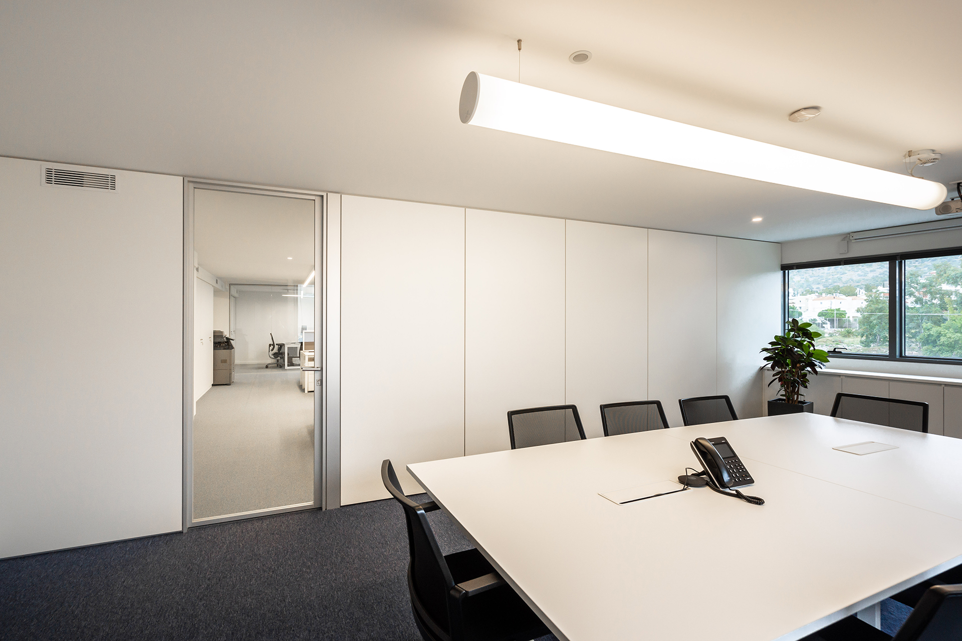 The Maritime Company trusted us once more for the supply and installation of office equipment in their new facilities.The floor was covered with carpet tiles from the ESSENCE collection by TARKETT DESSO. The tiles that have been used are in three different shades, that align with the color palette of the corporate identity. This choice serves the purpose of creating zoning. Closed Office Spaces are created using the integrated sound insulating aluminium partitions system TREBE, in natural brushed matte finish. It consists of fully glazed surfaces in single or double laminated glazing and solid melamine parts that enhance the privacy. The system is completed with sound insulating glazed and solid doors with aluminium doorframe and a technical unit. The same doors can be installed in existing wall openings as well. Blinds are included between the double partition glazing, as an extra feature for privacy.
