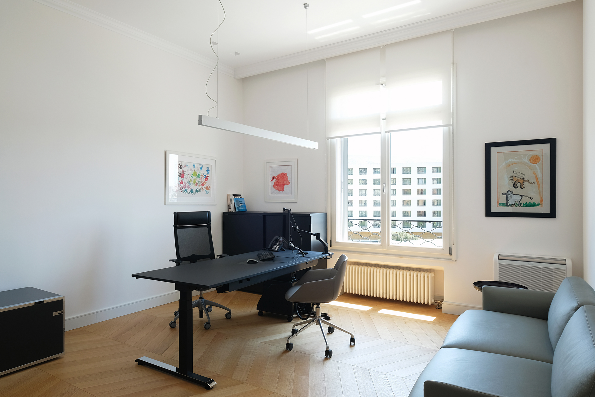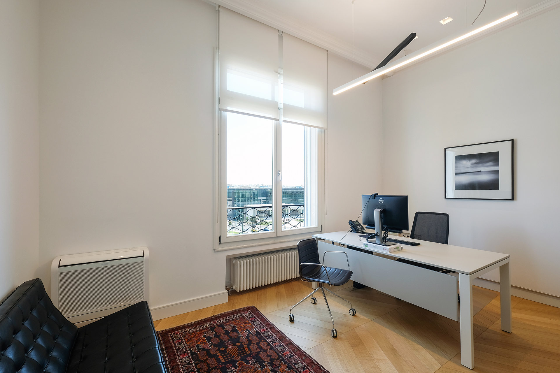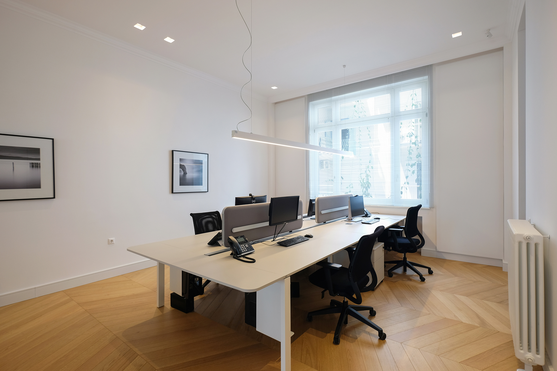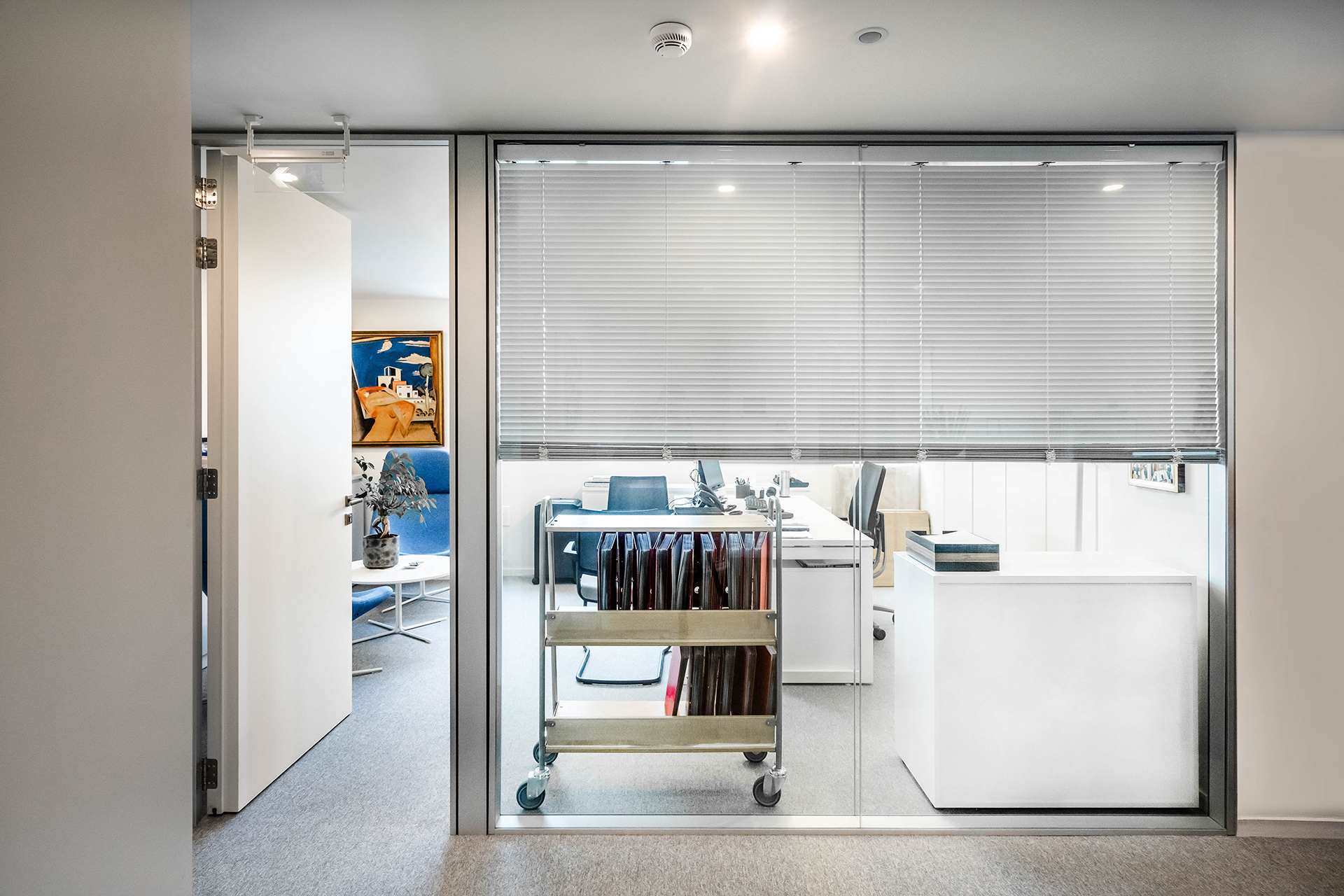 The Maritime Company trusted us once more for the supply and installation of office equipment in their new facilities.The floor was covered with carpet tiles from the ESSENCE collection by TARKETT DESSO. The tiles that have been used are in three different shades, that align with the color palette of the corporate identity. This choice serves the purpose of creating zoning. Closed Office Spaces are created using the integrated sound insulating aluminium partitions system TREBE, in natural brushed matte finish. It consists of fully glazed surfaces in single or double laminated glazing and solid melamine parts that enhance the privacy. The system is completed with sound insulating glazed and solid doors with aluminium doorframe and a technical unit. The same doors can be installed in existing wall openings as well. Blinds are included between the double partition glazing, as an extra feature for privacy.