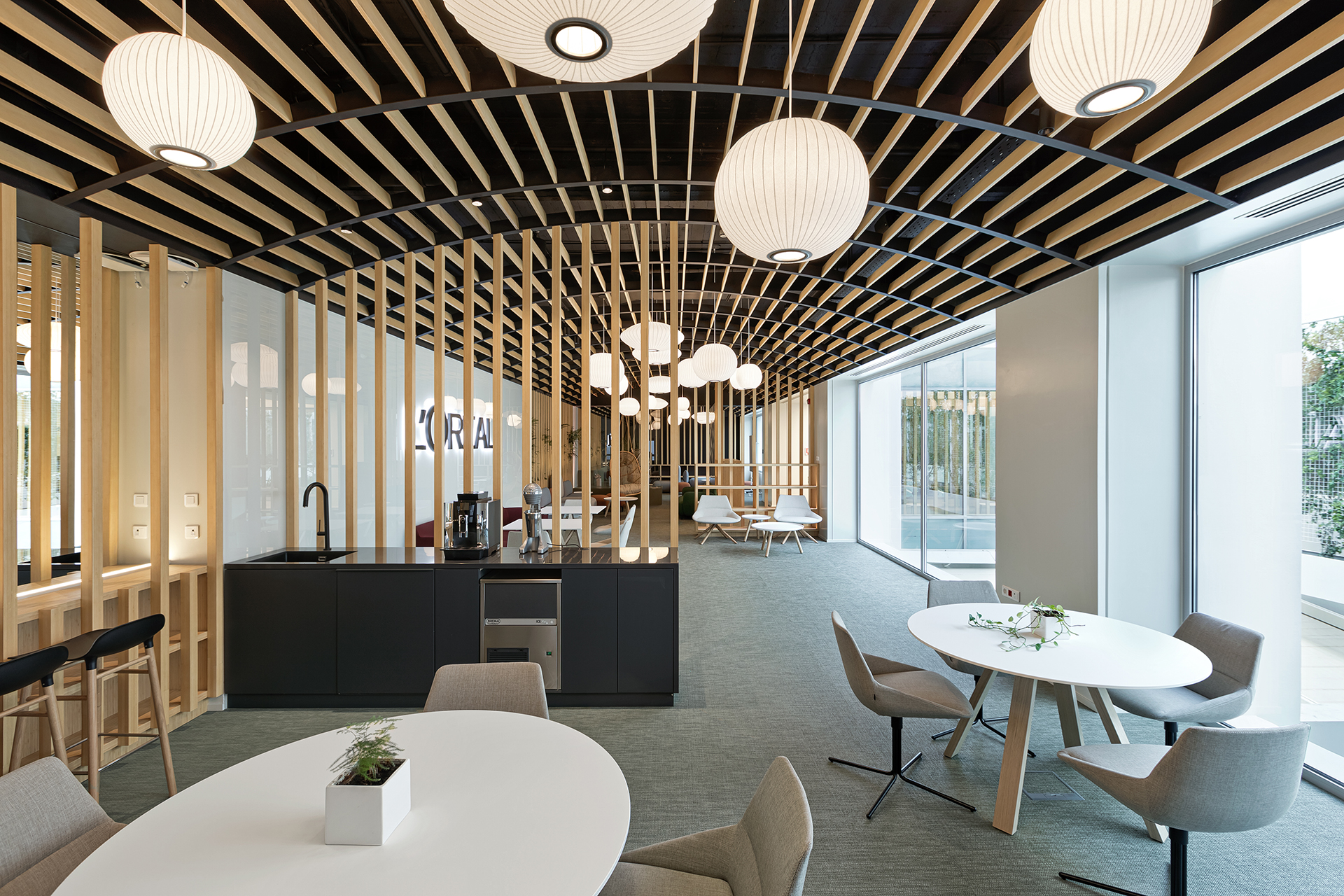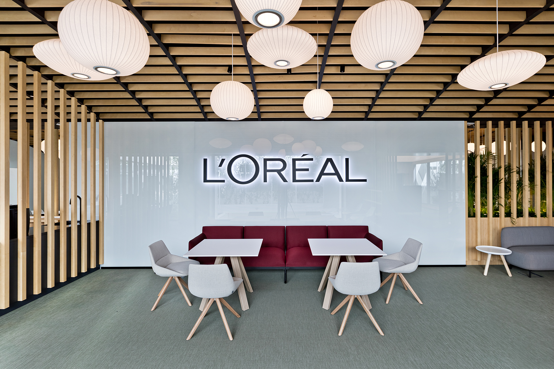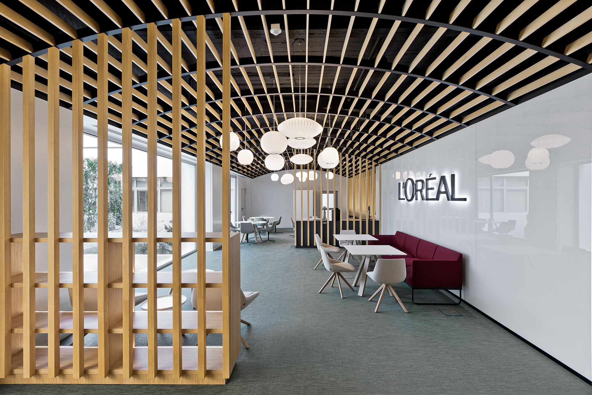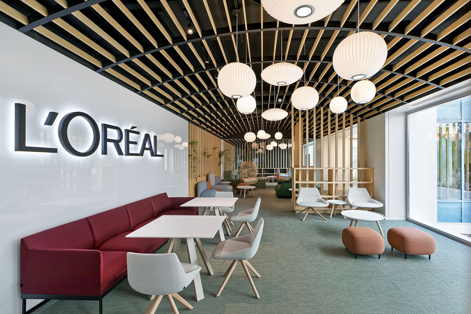 The aim was to transform the space into a collective area that can host events and support various uses, while at the same time provides a breakout area for L’oreal employees. The concept focused on flexible furniture and movable equipment as well as modular lounge systems.The relaxed environment was enhanced by upholstered furniture such as sofas and poufs that allow multiple combinations, matching the needs of a contemporary space.