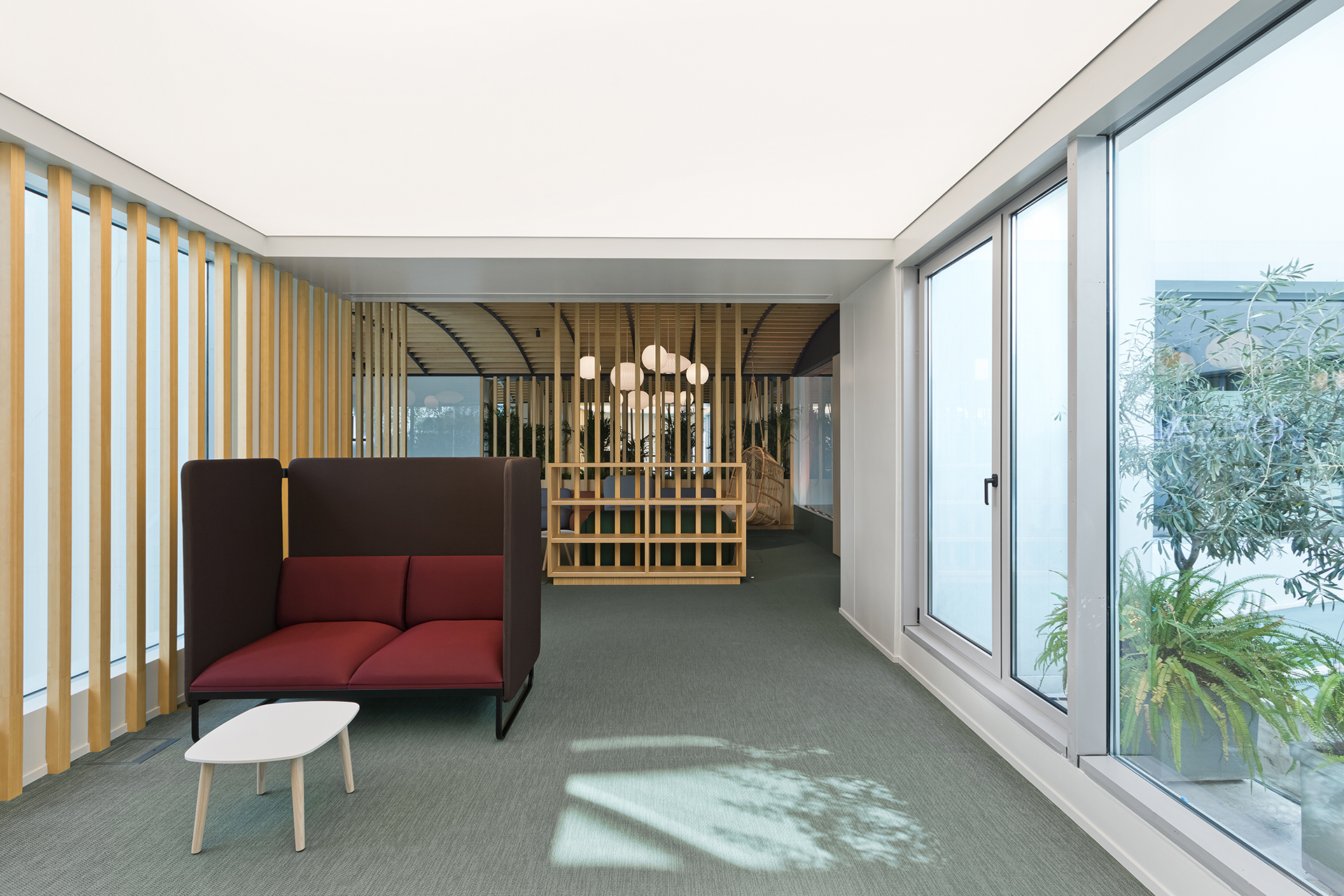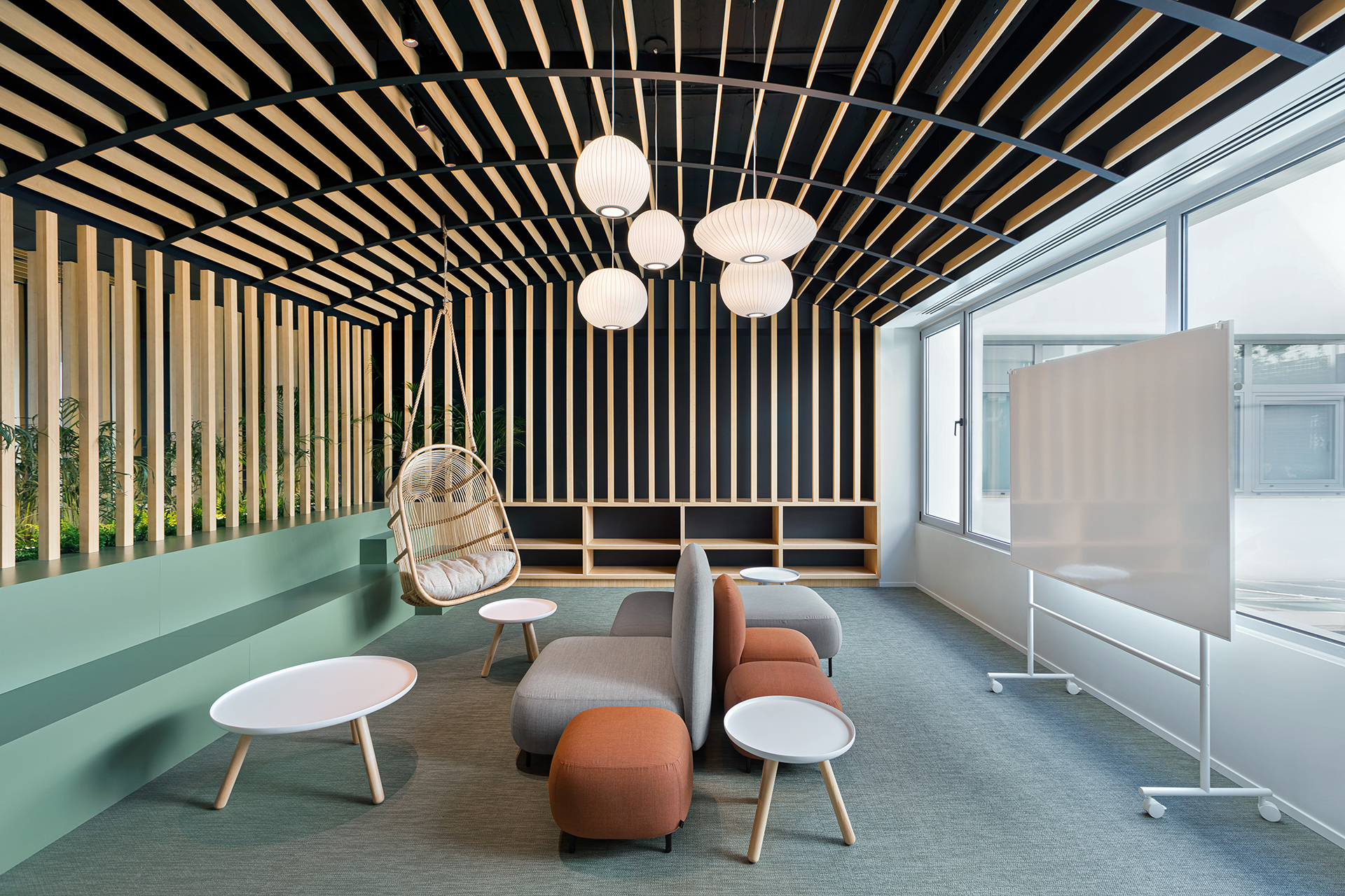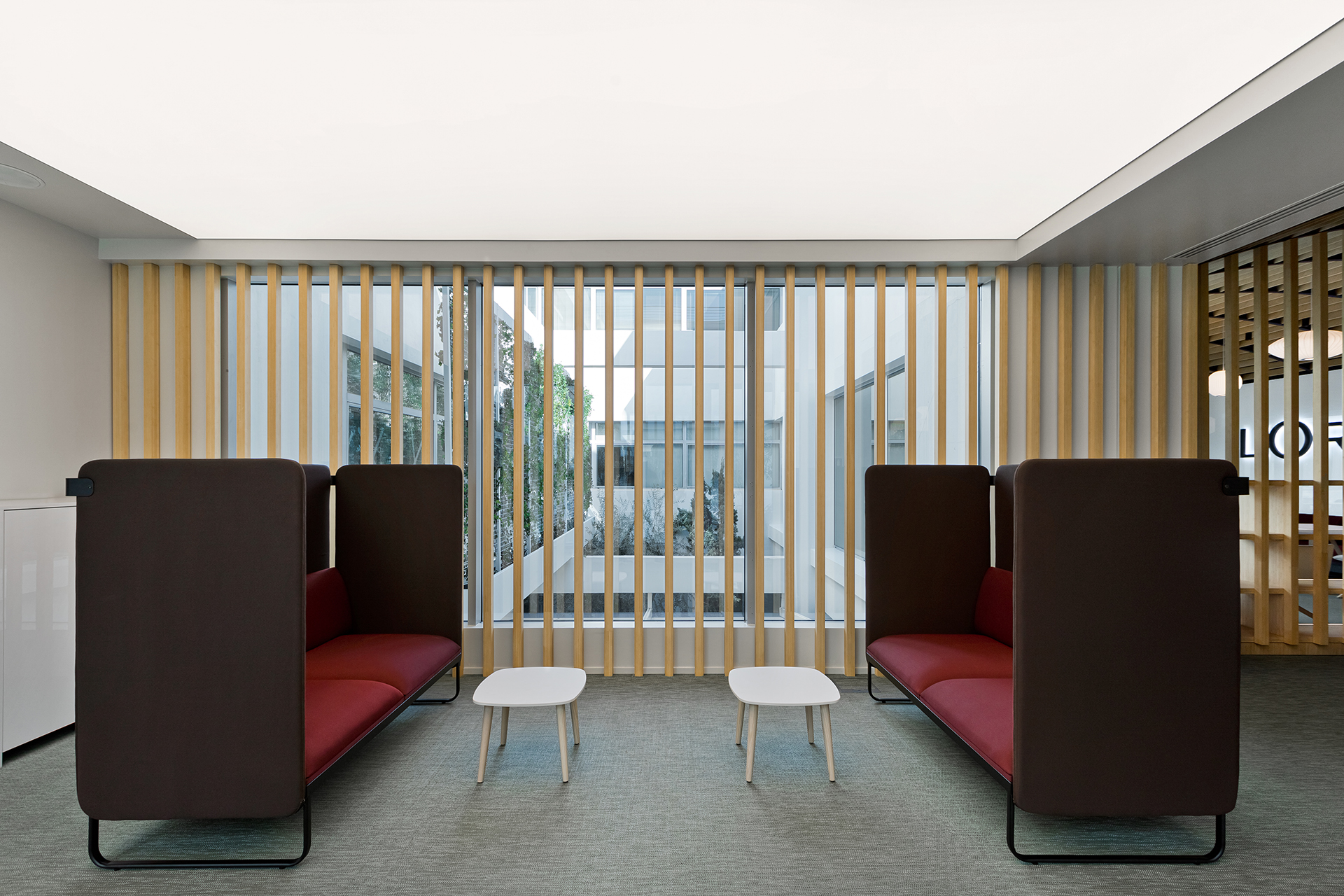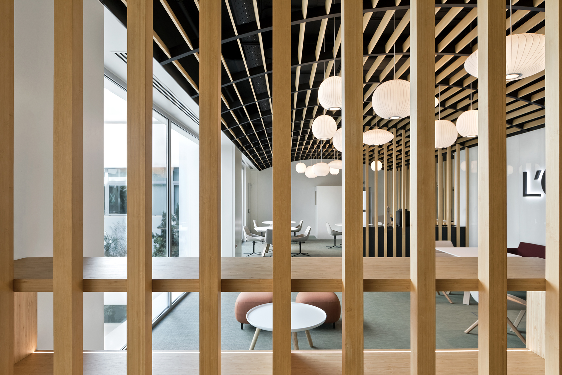 The aim was to transform the space into a collective area that can host events and support various uses, while at the same time provides a breakout area for L’oreal employees. The concept focused on flexible furniture and movable equipment as well as modular lounge systems.The relaxed environment was enhanced by upholstered furniture such as sofas and poufs that allow multiple combinations, matching the needs of a contemporary space.
