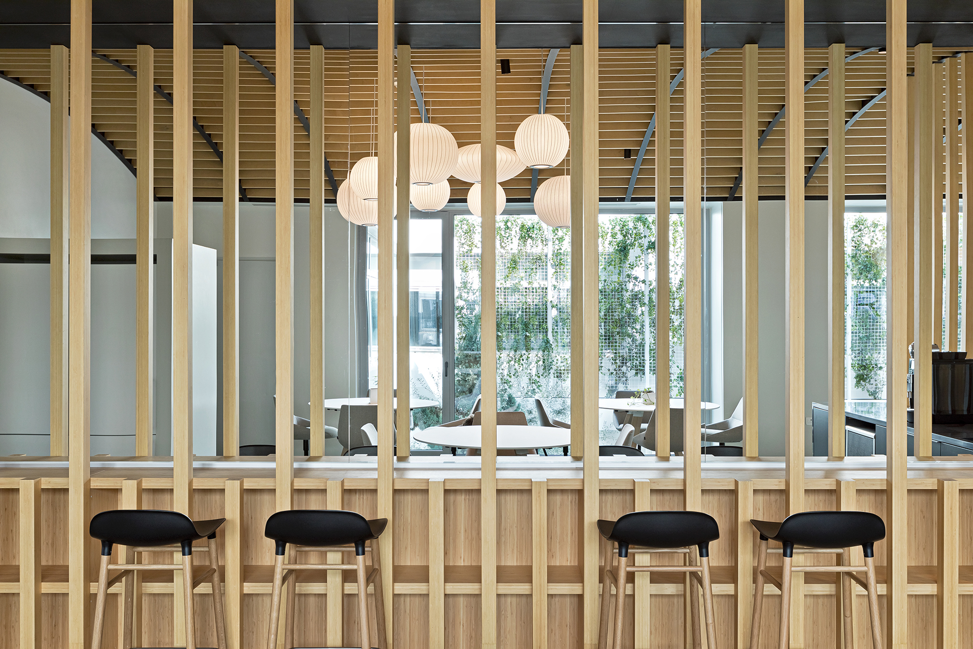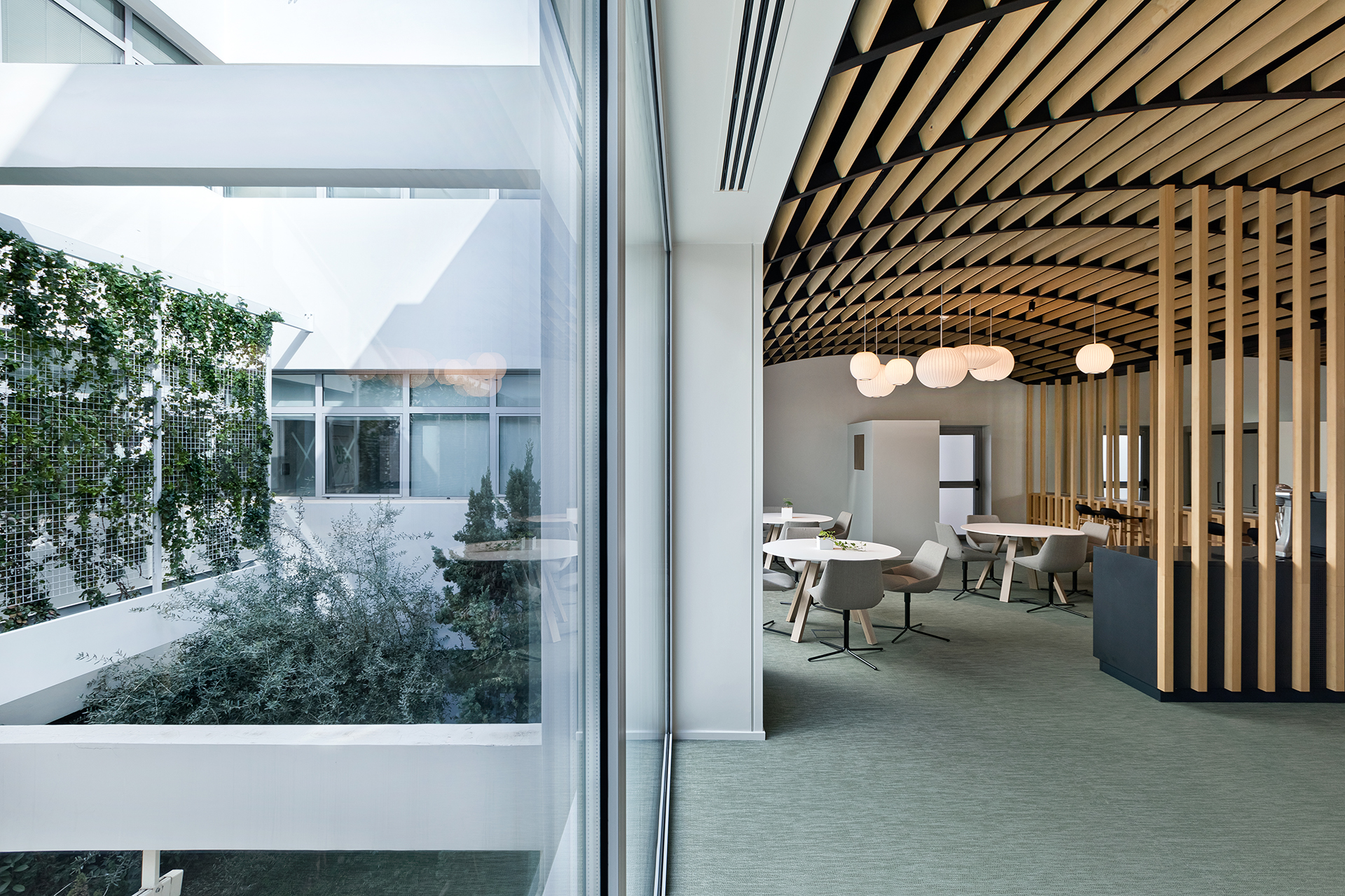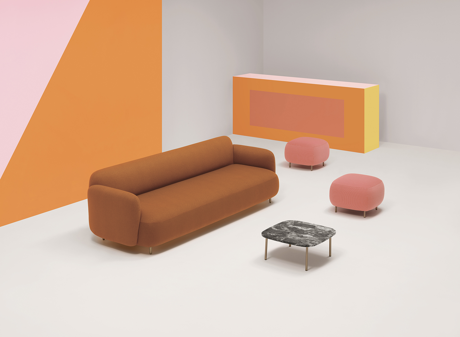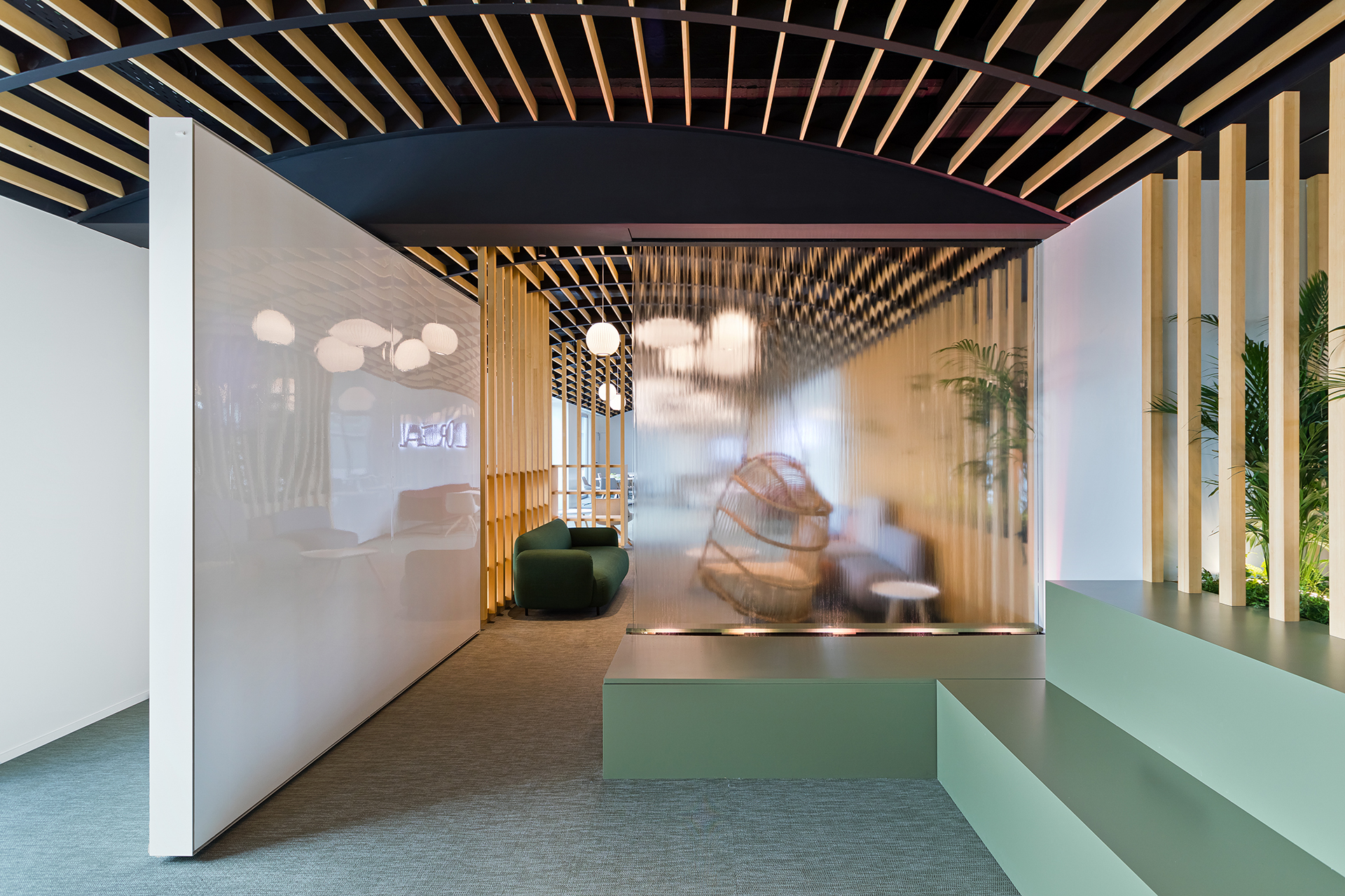 The aim was to transform the space into a collective area that can host events and support various uses, while at the same time provides a breakout area for L’oreal employees. The concept focused on flexible furniture and movable equipment as well as modular lounge systems.The relaxed environment was enhanced by upholstered furniture such as sofas and poufs that allow multiple combinations, matching the needs of a contemporary space.